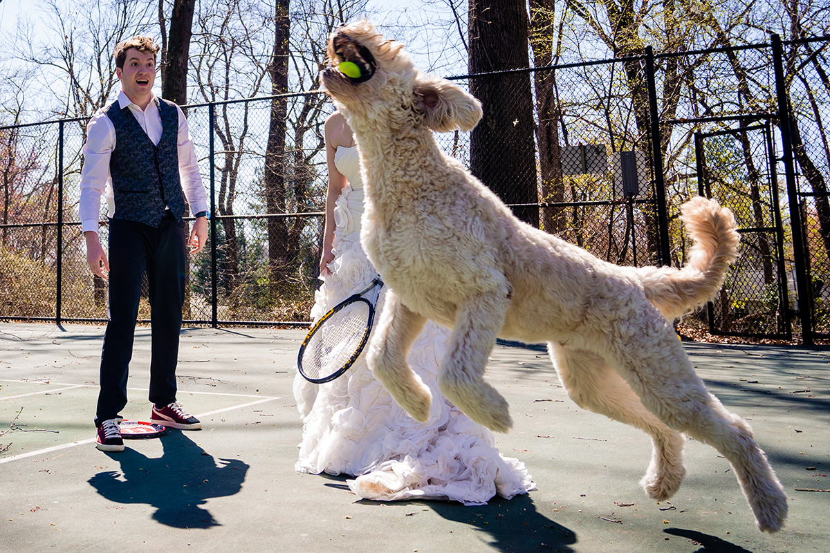 Sabrina and Mike came prepared. In fact, they made playing with Max an integral part of their wedding photo session. Dunn Loring Park has two tennis courts, so the couple brought rackets and a sleeve of balls. They then spent the first part of their photoshoot batting the tennis balls back and forth in their wedding clothes. And naturally, Max chased after them the entire time. We got some awesome shots of the big friendly dog loping and leaping in the air.